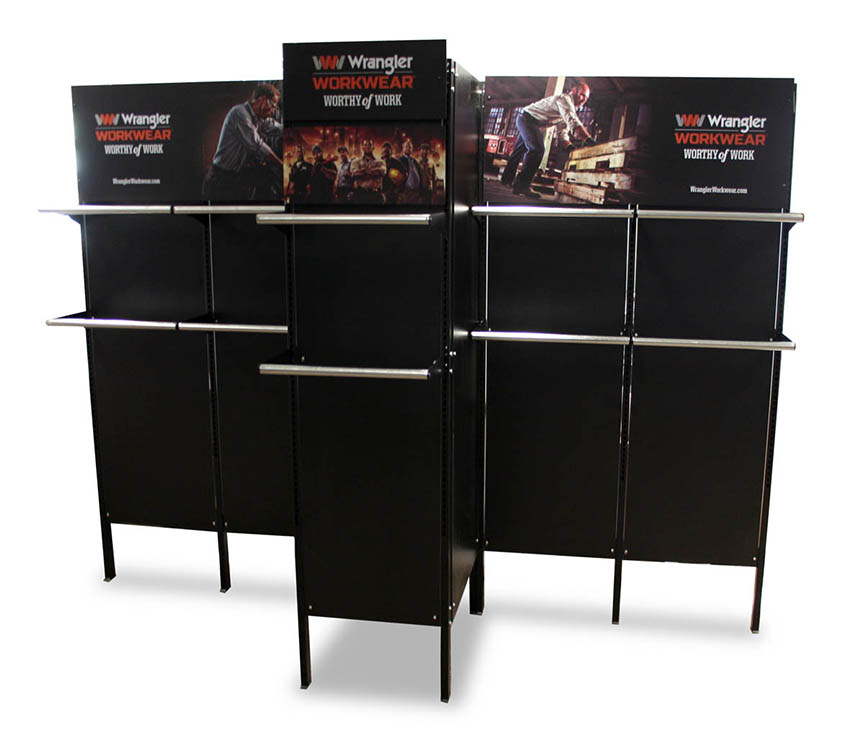 - Wrangler Workwear Modular Wall– Our intent for the modular wall shown below was to create a freestanding wall unit that featured heavy branding while also showcasing 2 levels of hanging product. To accomplish this, we utilized a metal tube structure, direct printed PVC panels, and chrome hang bars.