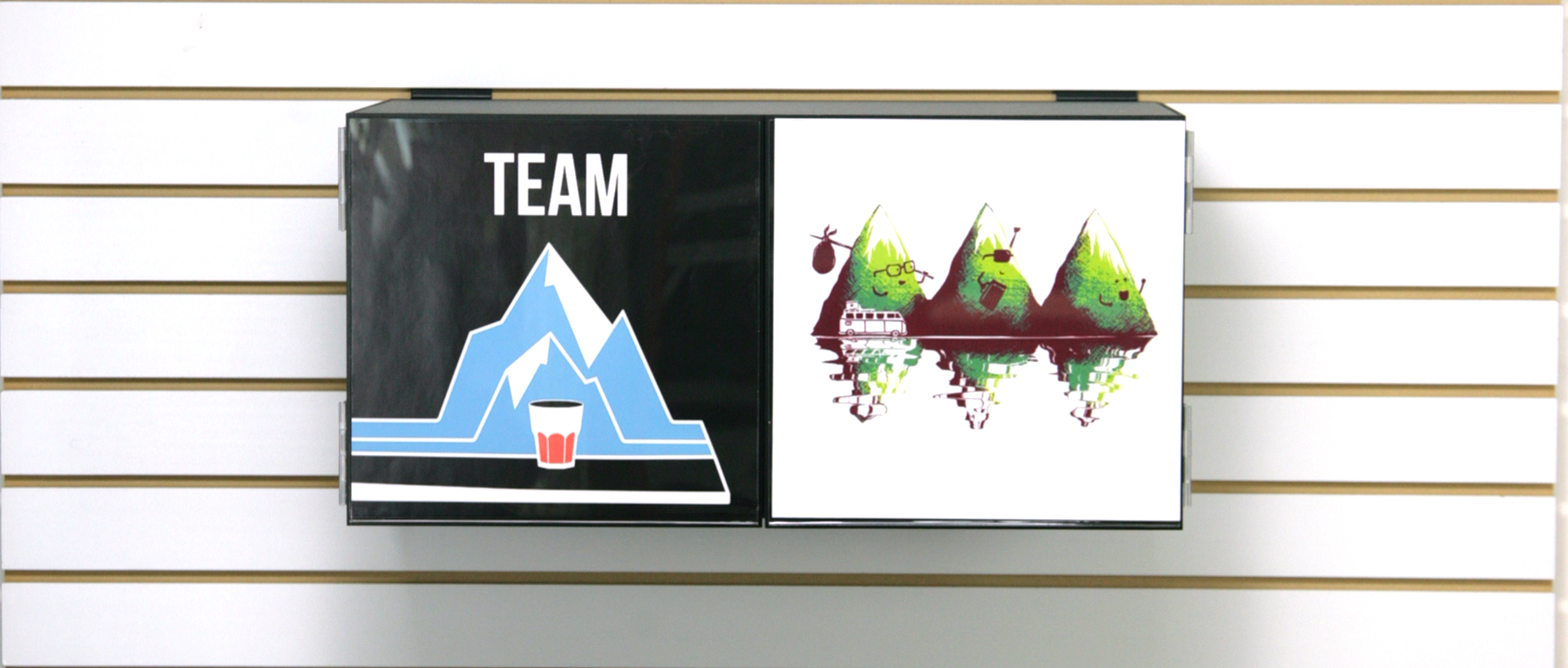 - Slatwall T-shirt Cubby Cabinet– While admittedly not the most exciting apparel display from a visual standpoint, the t-shirt cubby cabinet display shown below is both highly practical and functional. Shown closed and open below, the cabinet includes a graphic of the t-shirt on the outside and includes rear hanging slatwall brackets. It’s one way to keep the t-shirt wall looking tidy at all times.