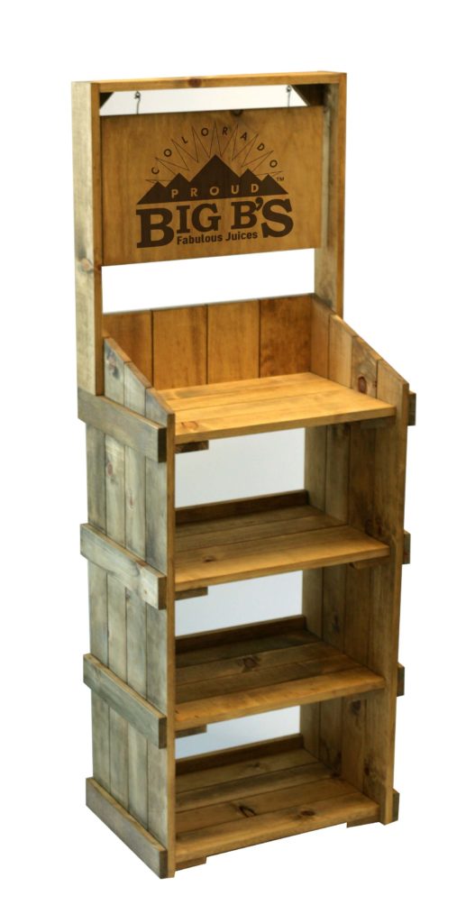 1. Big B’s Shelf Display– We’ll share one more bonus display. We made the Big B’s 4-shelf display shown below out of solid pine planks with a golden oak stained finish. We incorporated a direct printed hanging plywood sign. The display was intended to merchandise Big B’s line of juices, but this type of display could work for a broad range of products.