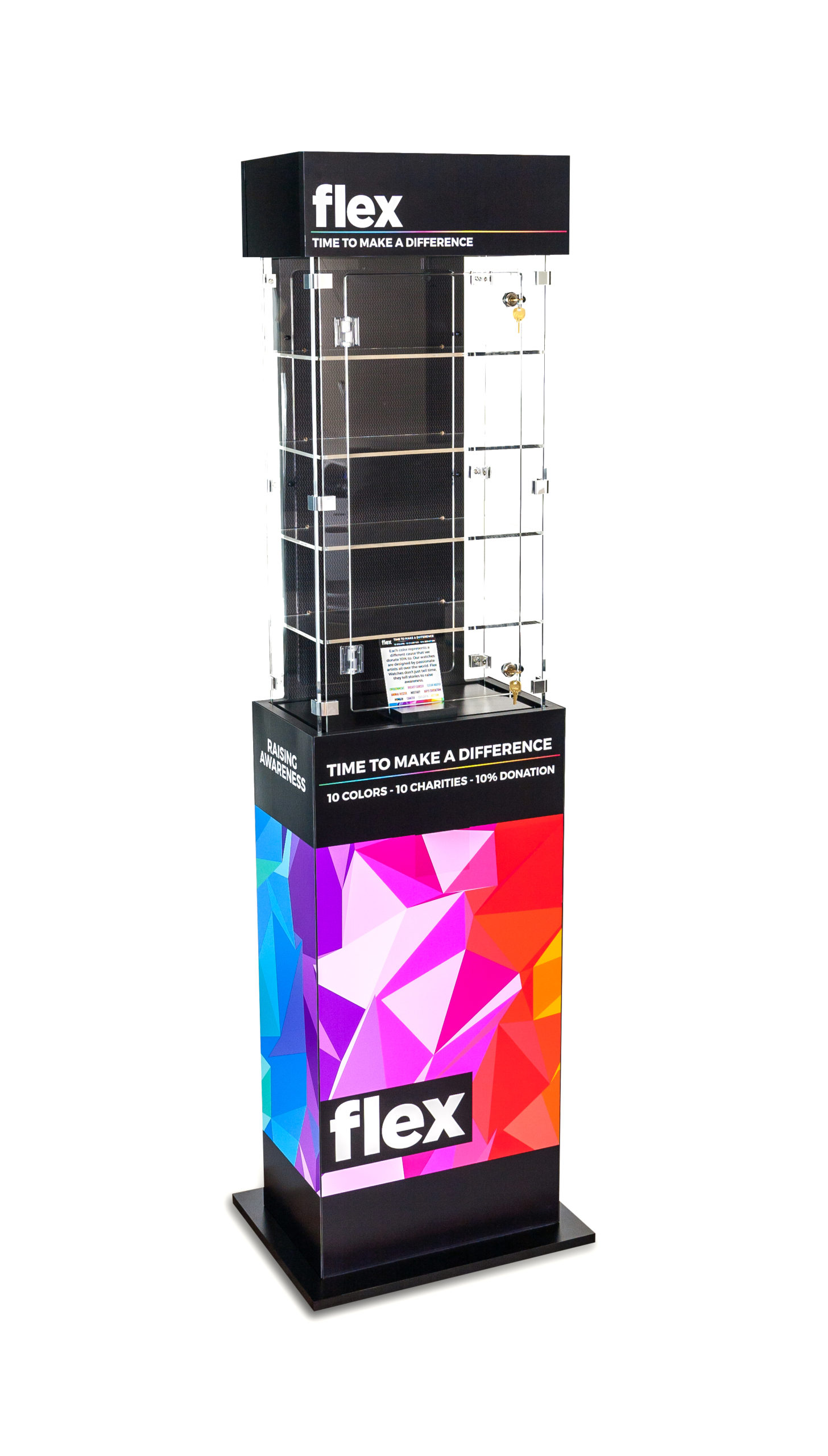 1. Flex Watches– We designed the display shown below for Flex Watches. Designed to be featured on the popular TV show “The Profit,” this display was intended to promote the company’s line of 10 colorful watches, each of which supported a different charity with a 10% donation. We constructed the base of the unit using MDF with direct printed graphics. The upper portion was a locking acrylic case with interior shelves. In addition to the bright, colorful graphics, the “Time to Make a Difference” messaging helped to communicate the brand’s story.