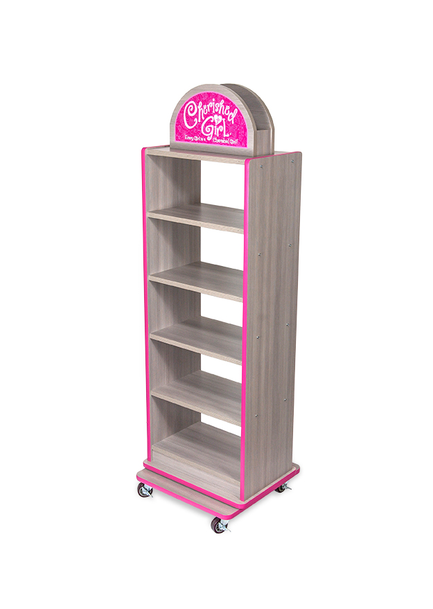 1. Cherished Girl T-Shirt Display– We made this 5-shelf, spinning t-shirt floor display for the Cherished Girl brand. We constructed the display using MDF with a high-end wood laminate. We chose bright pink edge banding to tie into the pink PVC header graphics.