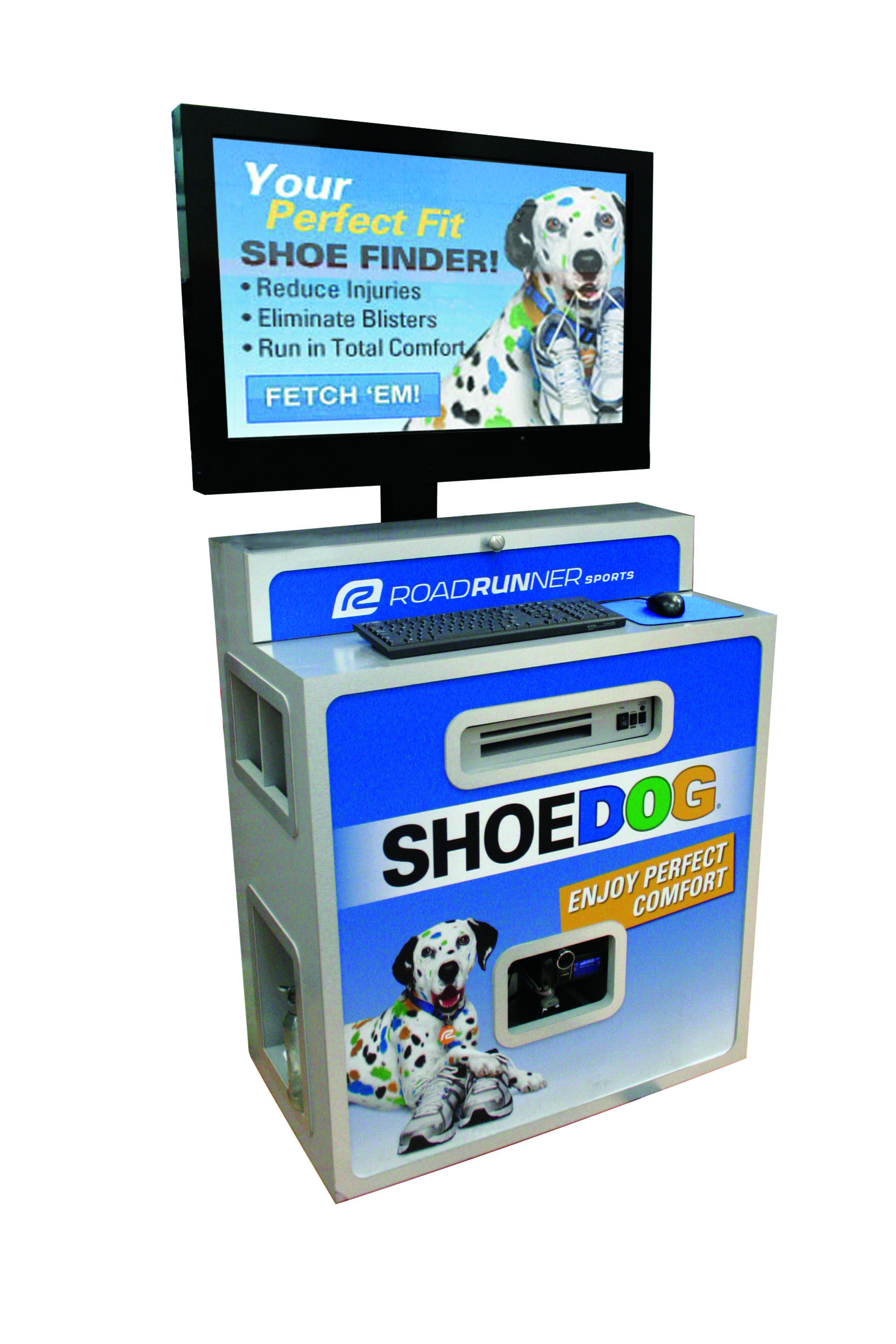 1.  Roadrunner Sports Kiosk– We designed this high-tech kiosk for Roadrunner Sports stores. Dubbed “Shoe Dog,” the kiosk was placed next to a treadmill so a footwear consultant could help a customer select the right shoe. The camera inside the kiosk produced a live video feed which was displayed on the video screen. We built the kiosk to accommodate a PC as well as providing additional inside storage. We decorated the kiosk in vibrant Shoe Dog graphics.