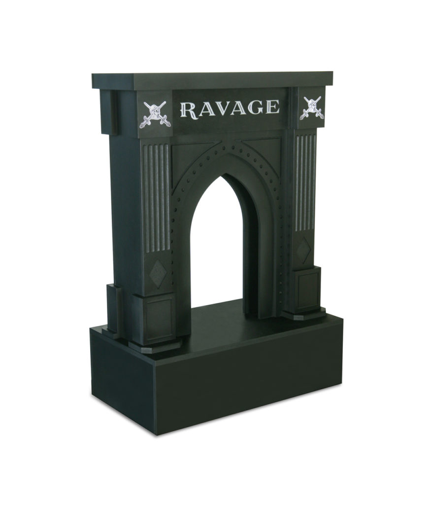 1. Ravage Wine Display– We designed and fabricated this gothic fireplace display for Constellation Brands’ Ravage Wine brand. We used MDF as the core construction material and added a matte black painted finish with laser-cut metal logo elements. The fireplace served as a centerpiece for stacked cases of wine, and the top shelf was used to display individual bottles of wine.