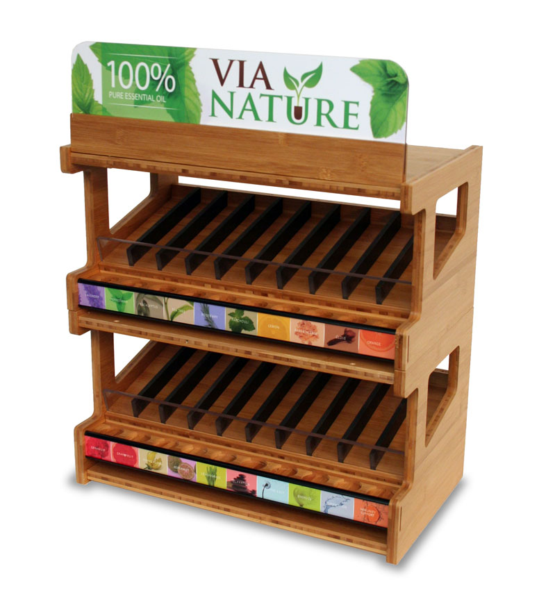 1. Via Nature Counter Display– We designed this modular 2-tier solid bamboo display to merchandise Via Nature’s line of essential oils. Given its natural and sustainable properties, bamboo proved to be an excellent material choice. We created recessed holes for tester bottles, clear acrylic shelf fronts, black PVC dividers, metal shelf channels with printed shelf graphics, and a die-cut PVC header sign. Each module could be used independently or stacked to make a 2-tier display.