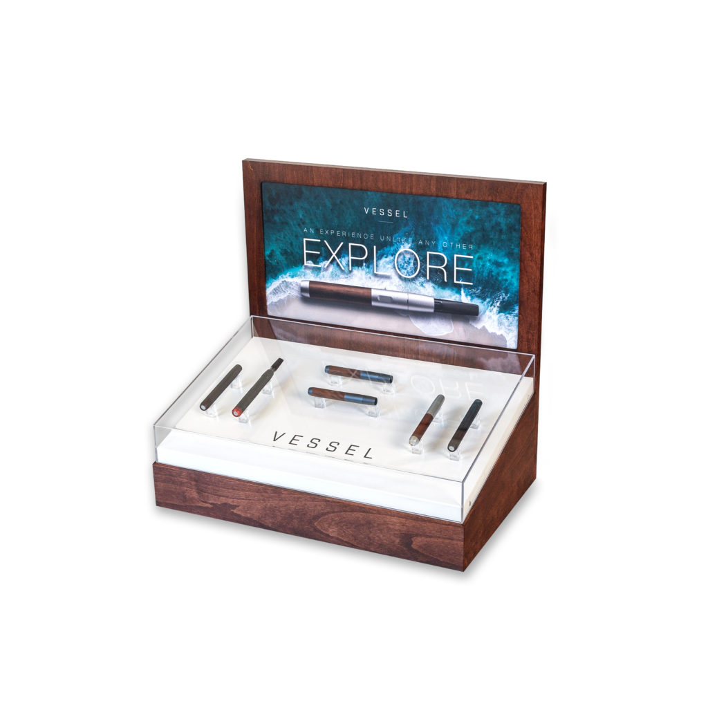 1. Vessel Counter Display– Vessel was interested in a premium look to merchandise its line of vape pens. We designed the display shown below using stained birch plywood, MDF with a white melamine finish, and a clear acrylic case with direct printed banding. We added acrylic vape pen holders and a PVC header graphic.