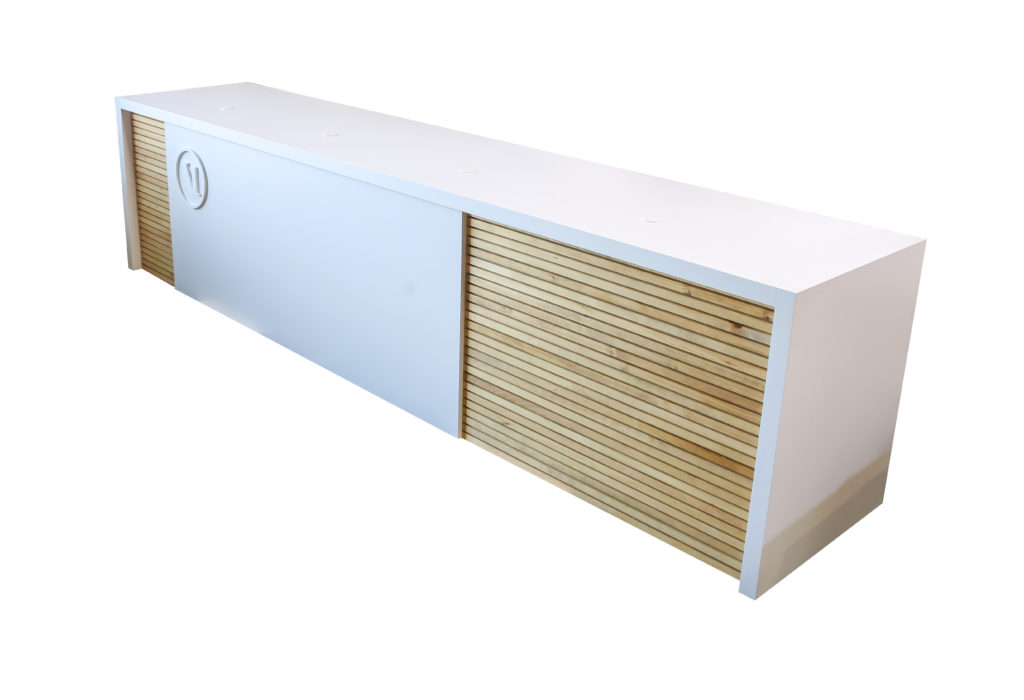 1. Vuori Cash Wrap– Our goal in making the 14 ft. cash wrap shown below was to portray furniture-quality craftsmanship that would mirror the quality and craftsmanship of Vuori’s line of performance apparel. The cash wrap featured birch plywood and MDF construction with Post Form Designer White laminate and Solicore, a laser-cut acrylic logo, golden oak stained solid pine slats, and inside storage.