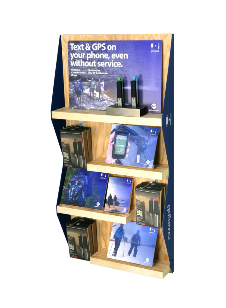 1. goTenna Endcap Display– We created this end cap display for goTenna’s Mesh text and GPS Off-Grid communication device to support a national REI rollout. We used unfinished birch plywood as the core material to fit in with REI’s store aesthetic. We used sheet metal side panels with screen-printed messaging, and we incorporated shelves, slatwall hooks, PVC signs, and product glorifiers.