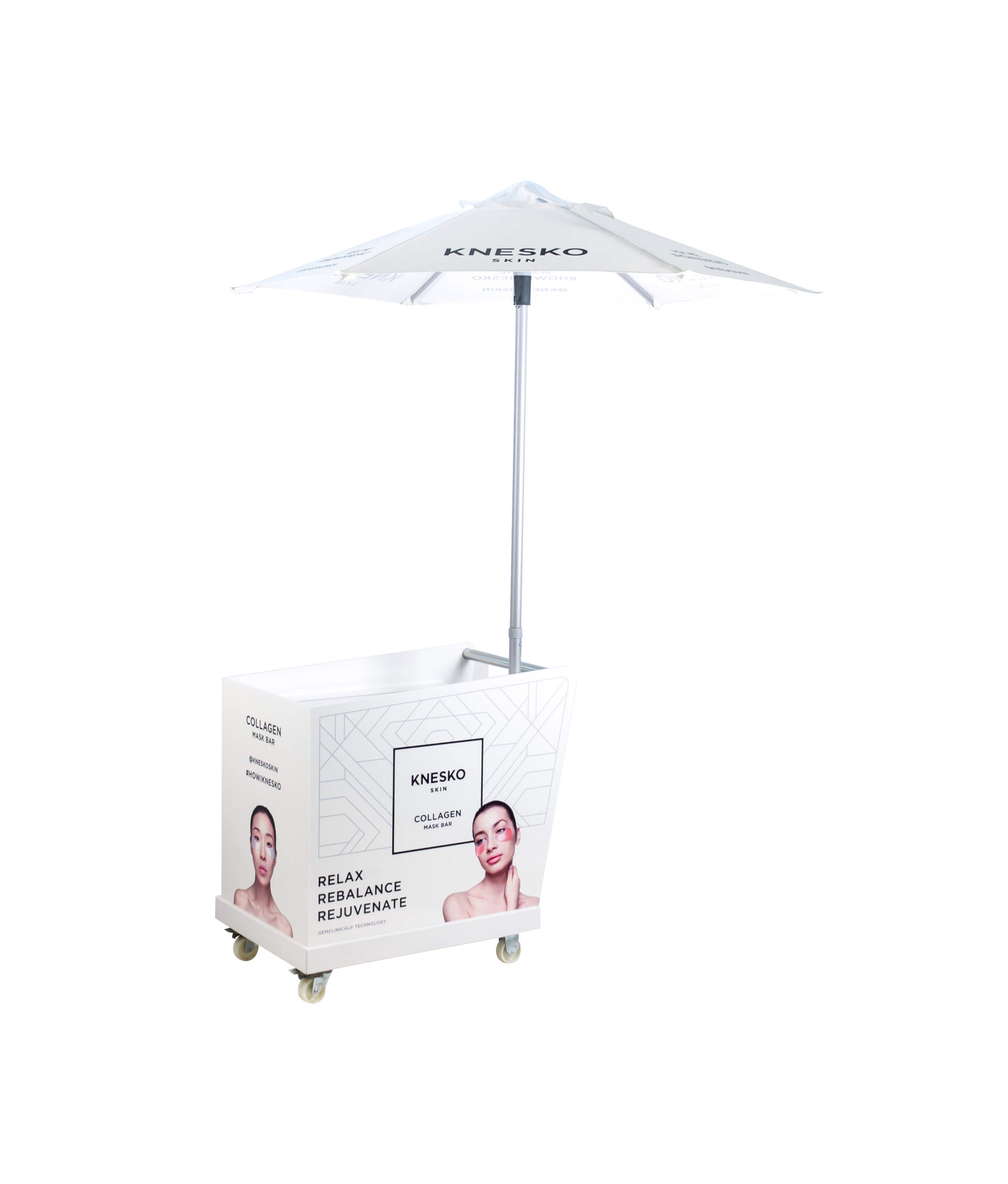 1. Knesko Skin Cart– We built this branded rolling cart to bring Knesko Skin’s line of luxury, scientifically formulated collagen under-eye masks to resort patrons while they relax by the pool. The cart featured solid surface construction with direct printed UV-protected graphics. It included locking casters, a removable ice bin to keep the masks cold, locking inside storage, and a branded umbrella.
