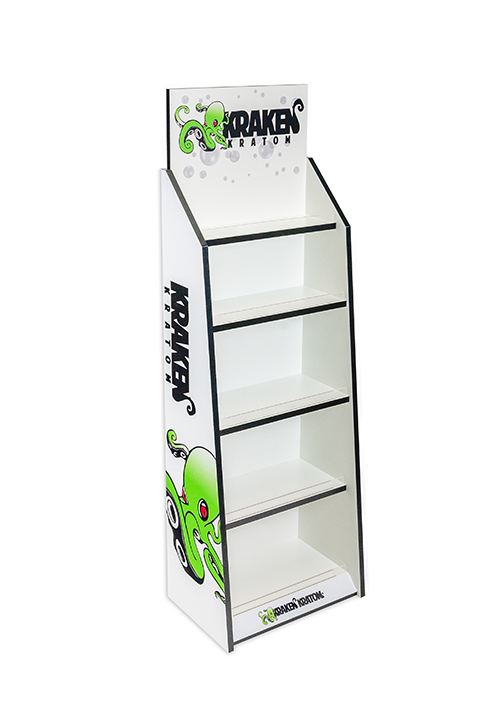 MDF often comes with a melamine finish which is sufficient for many POP instore display applications. It can be edge banded to created a finished look, and its smooth surface is ideal for direct printed applications as shown in the floor display below that we made for Kraken.