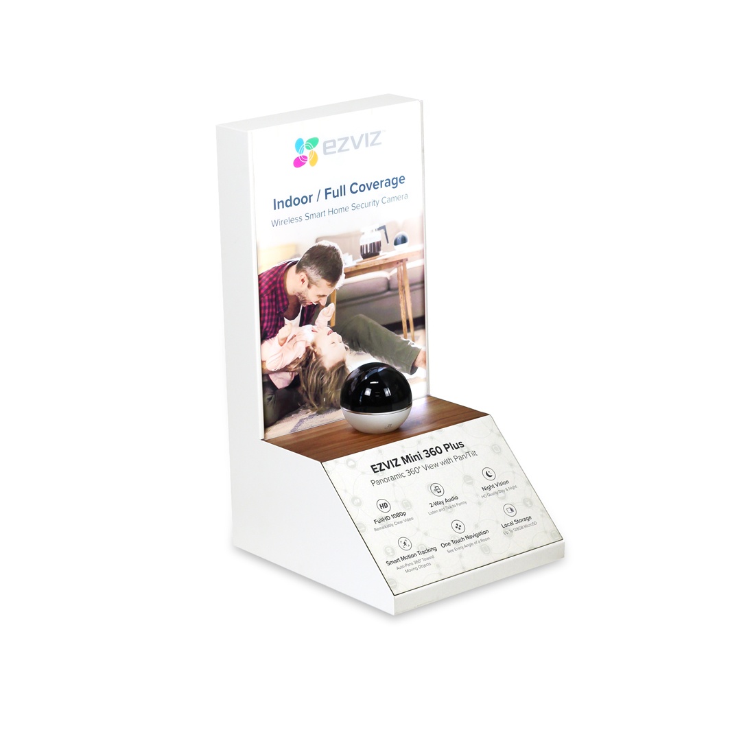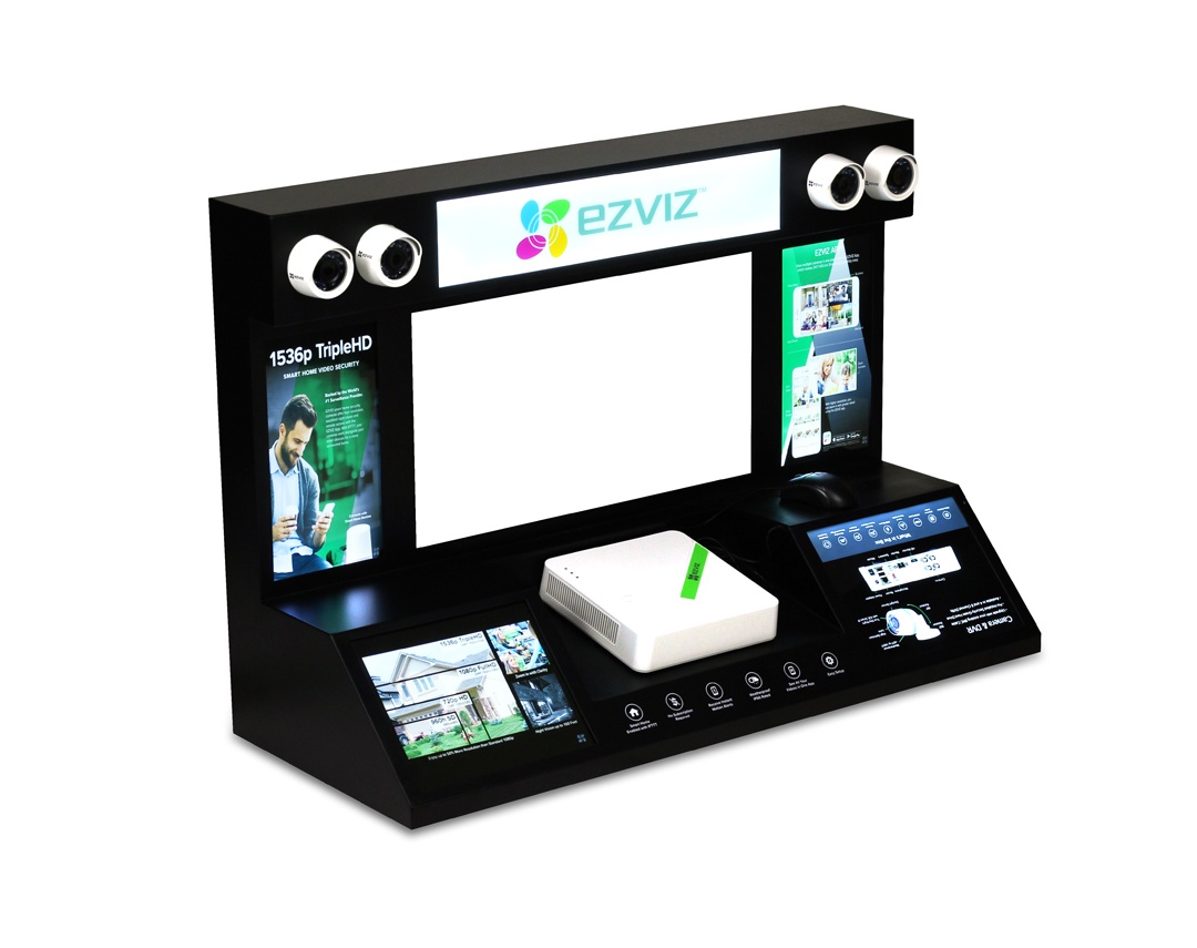 The examples below represent a full line of displays that we developed for EZVIZ. These displays can be found in leading retailers such as Best Buy Mexico, Best Buy Canada, National Furniture Mart, B&H, and a number of other retailers. The first display shown below is a 4-ft. unit showcasing EZVIZ’s wired security camera product. It features sheet metal construction with 4 mounted security cameras, a DVR, a large high definition monitor (shown as the large white box in the center of the display), 5 lightbox graphics, and permanent screen-printed graphics.