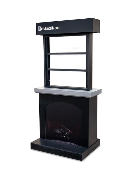 3) MantelMount Floor Display– We designed the large floor display shown below for MantelMount, the premier pull-down over-the-fireplace TV mount. One of the challenges with this display was to create a structure that was strong enough to hold a heavy TV mount with a solid clear acrylic panel. We used solid wood which we painted black before adding header and fireplace graphics. The structure was designed to be adjustable so that any one of 3 mounts could fit on the display. The display is versatile enough to be able to work in dealer showrooms as well as retail locations.