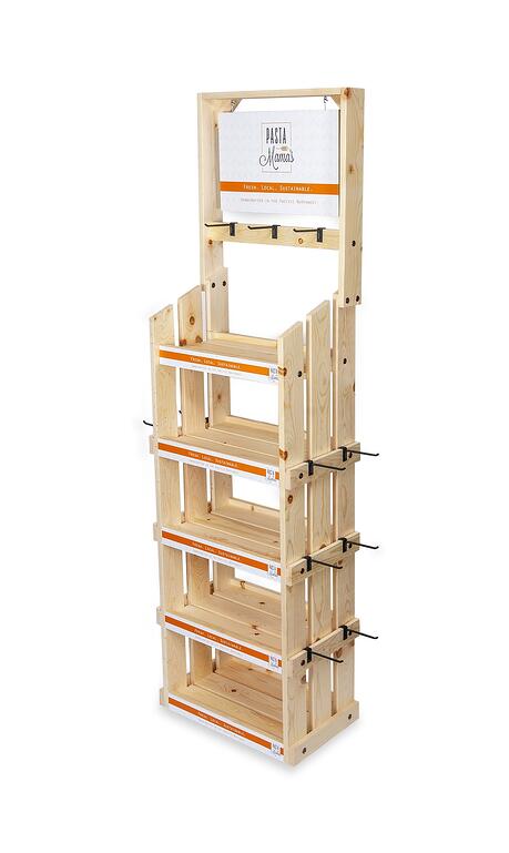 1) Pasta Mama’s Floor Display– Pasta Mama’s was looking for a floor display to merchandise its line of handmade, locally sourced pastas and sauces. To reinforce the brand’s story, we created the 5-shelf floor display shown below which we made using unfinished solid pine. We added PVC shelf graphics and a hanging sign to identify products and help promote the brand. We milled the side and header boards to accommodate adjustable hooks for hanging products.