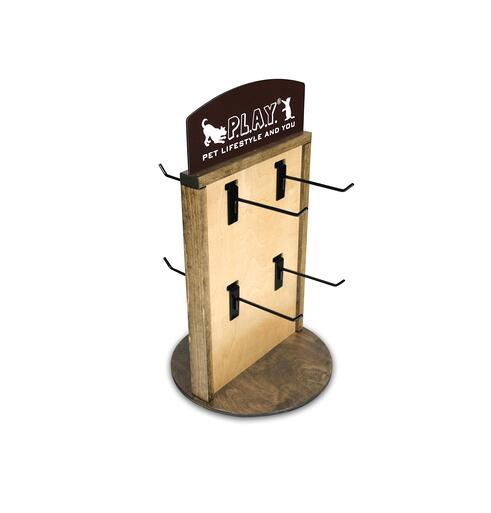 4) P.L.A.Y. Counter Display– Our fourth wood display example is the spinning counter display we made for P.L.A.Y. The display was designed to merchandise 8 SKUs of cat toys. We used walnut-stained pine for the base and panel frame and then constructed the main panel out of 2 pieces of slotted pre-finished birch to create some contrast with the frame and base. The panels accommodated standard slatwall hooks We added a 2-sided, die-cut PVC header sign.