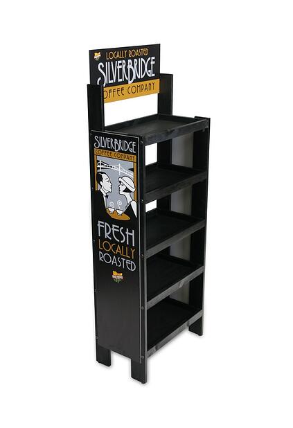 6) Silver Bridge Coffee Floor Display– We are frequently asked to customize our stock wood displays. Below is an example of how we did just that for Silver Bridge Coffee Company. We took one of our standard stock displays which we made out of solid pine. We painted it black and simply added header and side signs to reinforce the Silver Bridge brand and drive home the “locally roasted” message.