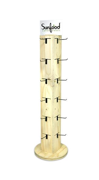 7) Sunfood Post Display– Sunfood has a full line of awesome natural food products. They like the raw wood look because it is consistent with their brand image. We made this small footprint, 4-sided slotted, spinning post display shown below to accommodate 24 hooks for bagged product. We added a 2-sided PVC header sign. This display works in almost any retail environment- from independent health food stores to convenience stores.