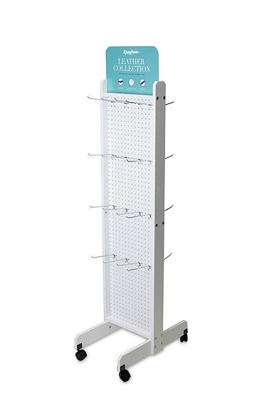 8) Zippy Paws Mobile Merchandiser– The 2-sided dog collar and leash mobile merchandiser shown below is a good example of a wood display that is both cost-effective and highly versatile. We used solid pine for the base and sides, added a pegboard panel with hooks and wheels, and painted everything white. We included a 2-sided PVC header sign to help promote Zippy Paws’ leather collection.