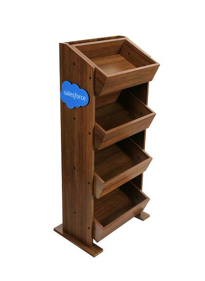 5) Salesforce Fruit Bin Rack– All of our examples so far have incorporated solid wood. The Salesforce fruit bin rack shown below is an example of an MDF display that utilizes a teak laminate. We used the teak laminate on all of the surfaces including the edges to create a uniform, high-end look. We included laser cut acrylic side signs which we second surface printed on the back side to reinforce the premium look of the display.